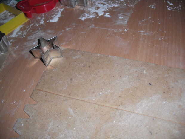 Creo que es mejor para una regla en la masa a los bordes rectos. Utilizar un transportador para obtener en el ángulo derecho. Hacer almenas utilizando los bordes de los cortadores de la galleta.