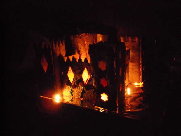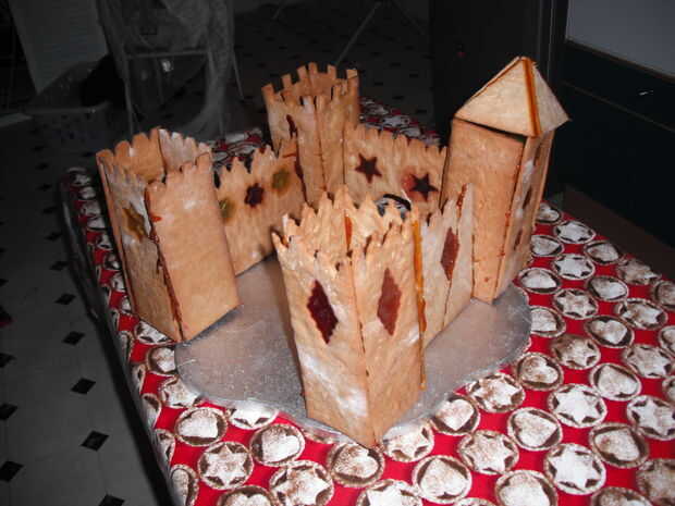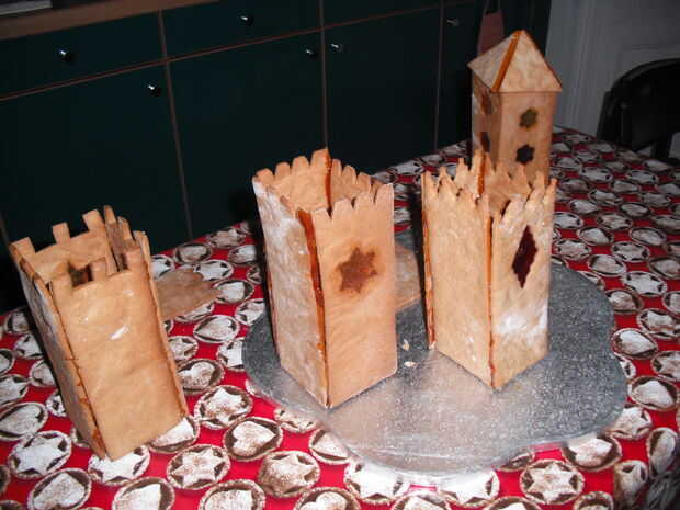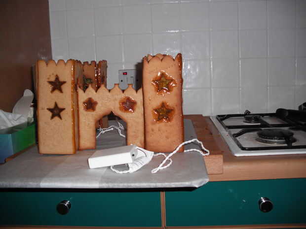 Una vez que todas las torres se construyen, poner todo en su base y pegar en los muros de conexión. Si están incluyendo luces (yo uso las luces del LED con pilas que puede obtener para alrededor de £2 de Ikea o supermercados) esto puede ser un buen momento para incorporar. Colocar algunas luces en las torres significa que usted obtiene el beneficio total de las ventanas de mi amor.
