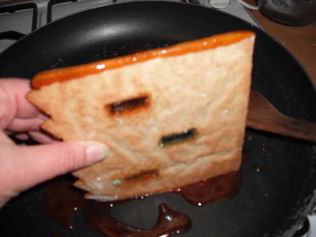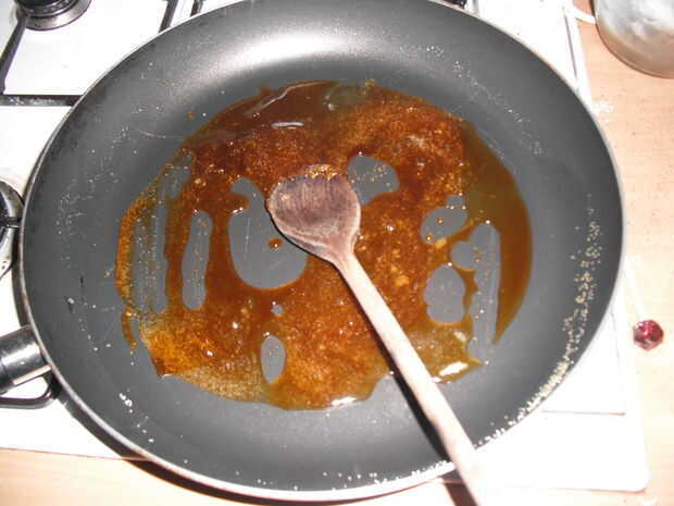 Derretir el azúcar en una cacerola. En la imagen he utilizado una sartén grande, porque puedo echar el borde entero de un muro de pan de jengibre del caramelo en lugar de tener que driblarlo. Esto generalmente funciona bien, a menos que como yo le cae su pan de jengibre del caramelo. Tienden a empezar con una cantidad bastante pequeña de azúcar y añadir más improvisador. El caramelo resultante sólo pega bien cuando está caliente, pero es oscuro y amargo si se sobrecalienta.