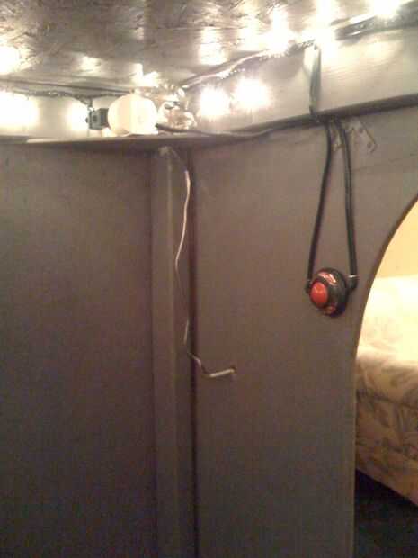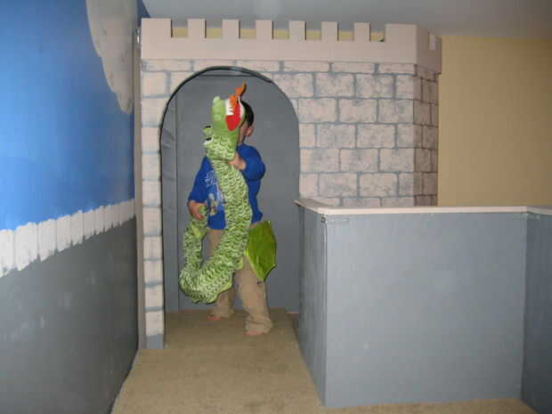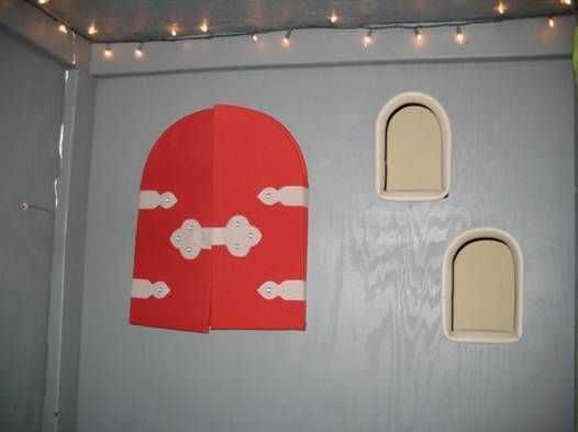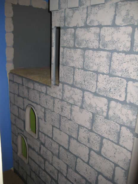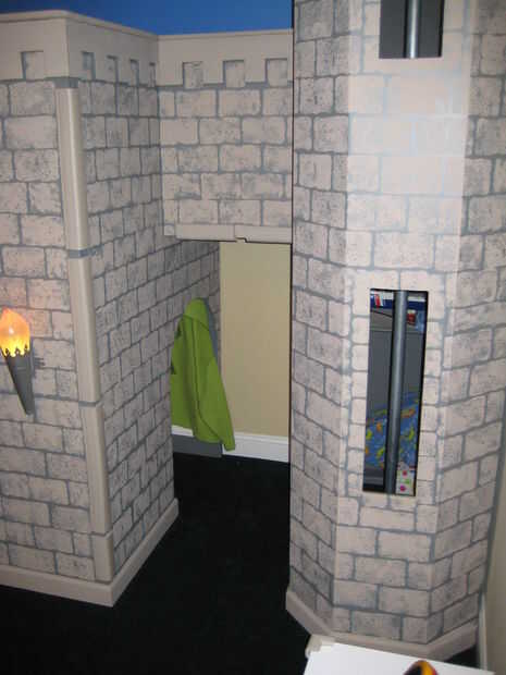 El frontal tiene dos antorchas de plástico que realmente parpadean para un gran efecto. Un escudo de madera se fija sobre la puerta principal que estaba guardada desde mi niñez. La torre tiene dos largas delgadas windows que se asemeja a los arqueros en castillos reales de windows.