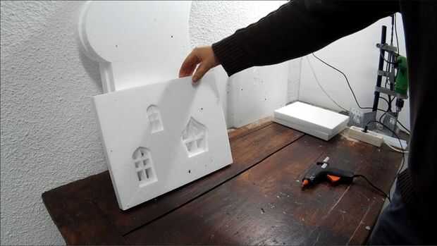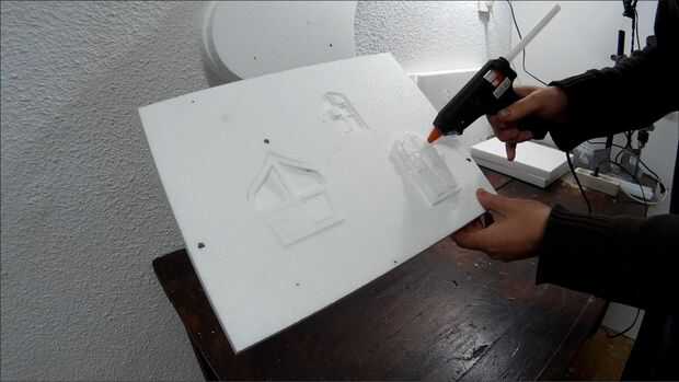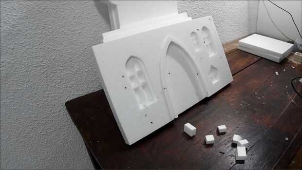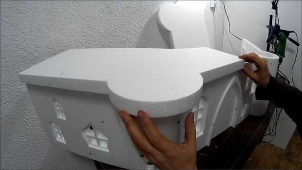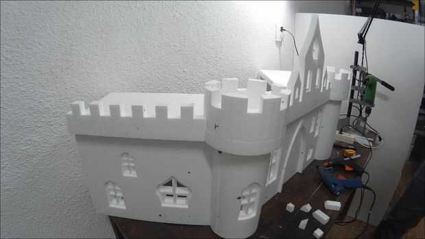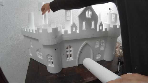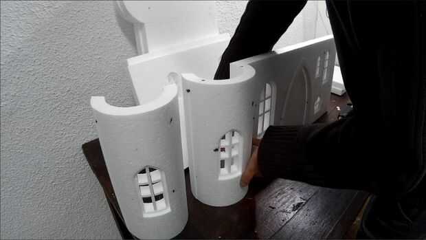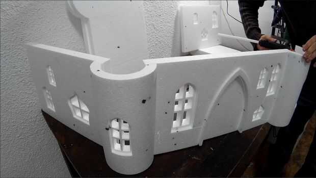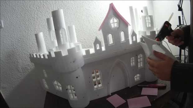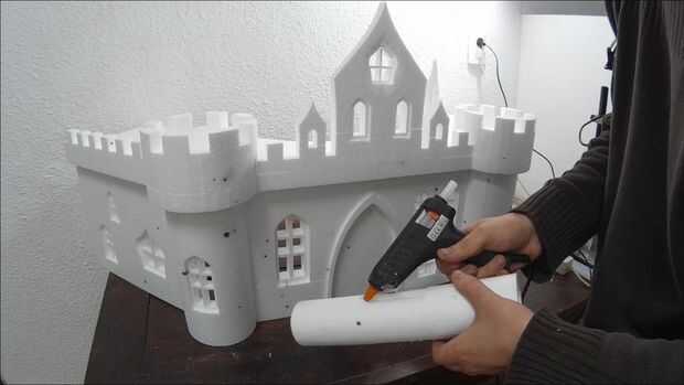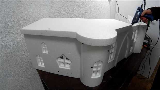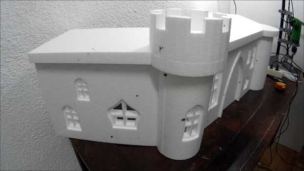 OK, la parte más difícil se hace. Ahora necesita pegar todo junto. Utilice pegamento caliente para esta parte. Asegúrese de que el pegamento no es demasiado caliente y derrite la espuma de poliestireno. Utilice un trozo sobrante para comprobar que está bien. Controlar los vectores constantemente para que no pegue las piezas mal. Cuando tienes que pegar una ventana empujarlo suavemente hacia dentro aproximadamente medio centímetro y péguelo en la parte posterior. No pegar las torres en el techo todavía.