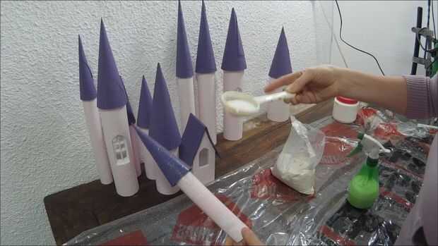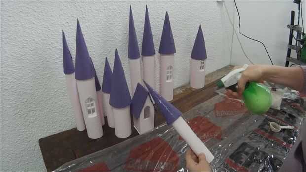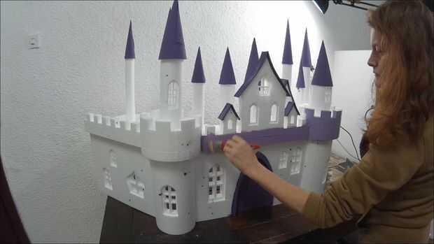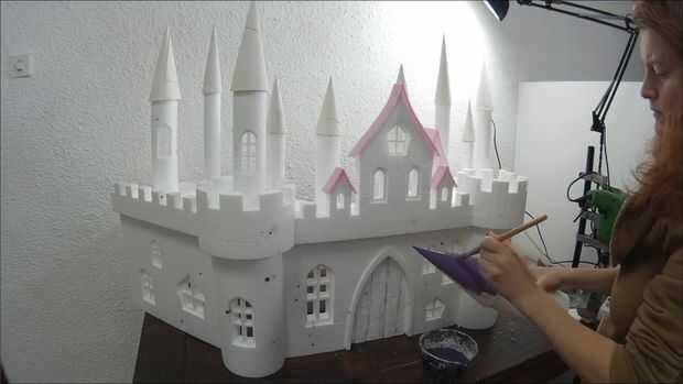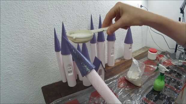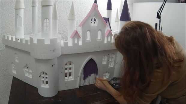 Pintar el castillo en los colores deseados. Utilizamos colores princesa y brillo para nuestro castillo pero se puede utilizar cualquier color que te gusta. Para la parte de brillo se necesita una botella del aerosol, agua, pegamento de madera (que se vuelve transparente cuando seca), un colador de té y por supuesto glitter (brillo translúcido de utilizar si es posible). Mezclar agua con cola para madera en una proporción 8:1 y ponga la mezcla en la botella del aerosol. Se rocía la superficie y utilizando el filtro se cernir el brillo sobre la superficie húmeda.