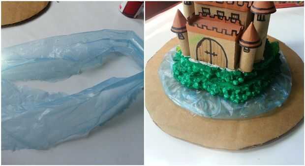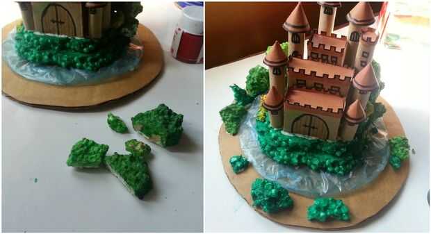 Cortar o romper en pequeños pedazos de la hoja de thermocol para hacer arbustos y árboles. Color con carteles de colores y pegar alrededor del castillo. Añadir tantos arbustos y árboles alrededor del castillo hacen el castillo ver aún mejor.