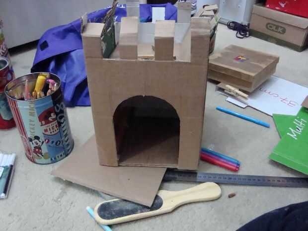 ¿qué haces?Hice un castillo de arena.¿Cómo lo hiciste?He utilizado trozos de cartón que pegan. Luego pinté el pegamento en los diferentes colores exteriores y espolvoreados de arena para hacer que las paredes parezcan arena. Luego tuve un voluntario