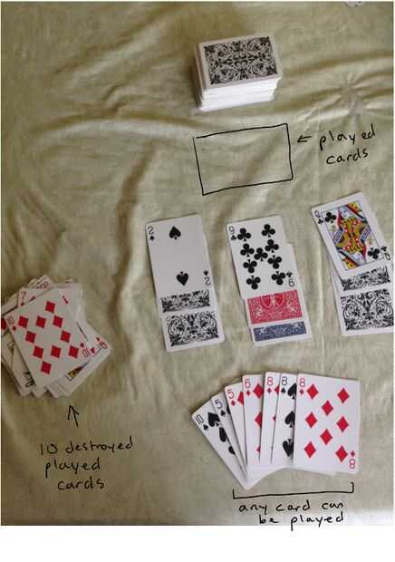 Una vez que ha dibujado y jugado a través de la cubierta restante, los jugadores quieren jugar todas las cartas en su mano. Una vez que no tienen más cartas, los jugadores pueden comenzar a utilizar las filas de las tarjetas en frente de ellos. Los jugadores usando las filas de tarjetas deben jugar todos los de la cara tarjetas antes de mover hacia abajo a la fila siguiente, pero el jugador puede elegir el orden en el que jugar. Del mismo modo, los jugadores deben usar todas las cartas de la fila dos antes de ir a la fila tres. Al alcance de los jugadores de la fila dos y tres, no se permite mirar las cartas. Cuando es su turno, simplemente debe escoger una tarjeta y dale la vuelta. Las mismas reglas desde arriba todavía se aplican. Si la tarjeta no es superior, un dos o una tarjeta diez el jugador debe recoger las cartas jugadas y jugar a través de su mano otra vez.