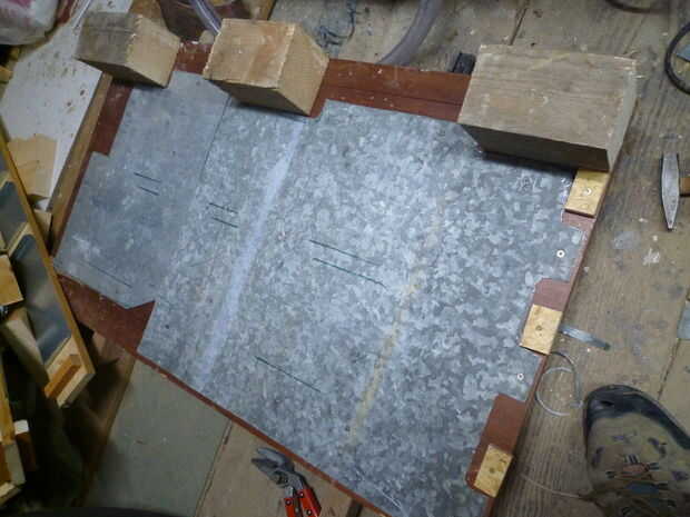 • El último paso para la base es proteger la superficie con recortes de 0, 55 mm galvanizada del metal de hoja. Puede utilizar una hoja entera si tienes no hay recortes, por supuesto.