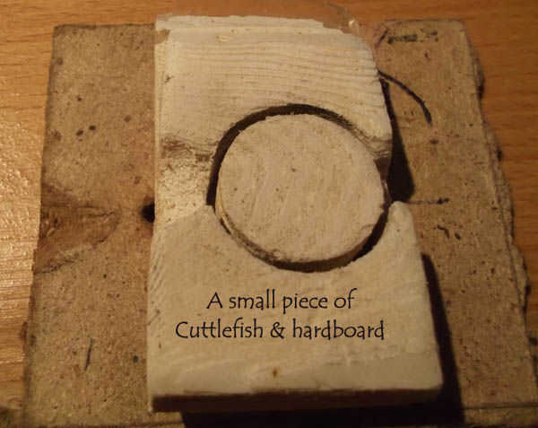 Tomar un pequeño trozo de madera prensada que se ajusta sobre la parte posterior de la sepia, esto se convierten en la parte posterior del molde, frotar esta placa ligeramente sobre el lado suave del hueso para que se sienta completamente.