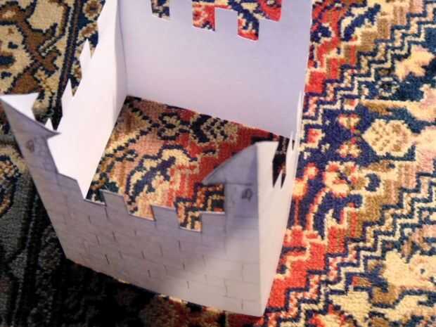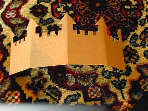Luego dibuje un castillo en uno de su lado, algo así como puedes ver en la imagen y corte doblado; cuando lo abres, tienes una plantilla cara Castillo cuatro con las torres en las esquinas dobladas. Cuando esté listo, copiar en una hoja de cartulina, cortamos dos veces para obtener dos castillos plegables mismo y pegar en la esquina abierta. Por supuesto, es una buena idea para pintar con diferentes colores o estilos, pero tienen que ser del mismo tamaño.