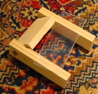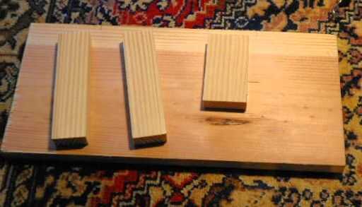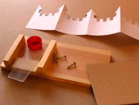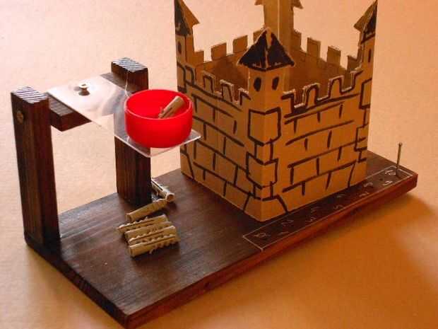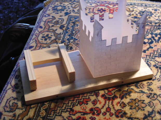 La base es un cca. hoja de madera de 20 cm x 10 cm. Por un lado puedes pegar o atornillar a la catapulta y en el otro lado puede colocar (o pegar) el castillo de cartón. Detrás del castillo que se puede taladrar 11 pequeños agujeros para un contador, para inscribirse los hombres perdidos en el castillo durante el asedio, con un palillo de dientes-contador. El máximo. número es 10, y, cuando el castillo alcanza el 0, su jugador ha perdido la batalla.
