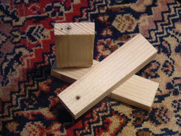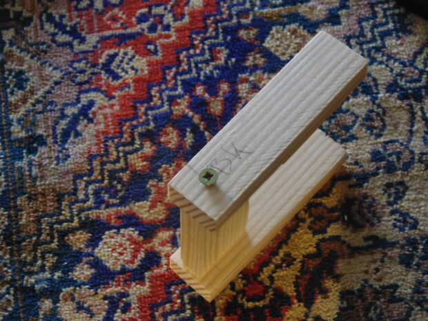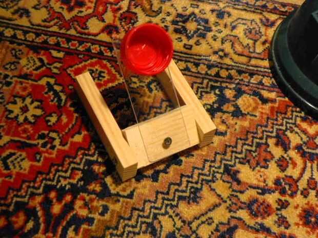 Ahora tienes que construir dos catapultas para poder apuntar y disparar con él. Primero corte dos más (cca. 5 cm) y una más corta piezas de madera de (cca. 2,5 cm) como se los puede ver en las imágenes. La anchura y la altura son opcionalmente, pero tratan de seguir las proporciones originales, si se puede. Ahora los agujeros del taladro en las dos piezas más tiempo juntas, para la exacta colocación simétrica de ellos y medir los puntos de la pieza más corta donde encajará este agujeros. Vea el dibujo de las explicaciones visuales. Ahora haz una tapa de la botella y un palo de plástico flexible y montarlos juntos como se ve en las fotos. La tapa puede pegar en el palo de plástico. Ahora ya está listo con la catapulta. Pintura o barniz, si quieres.