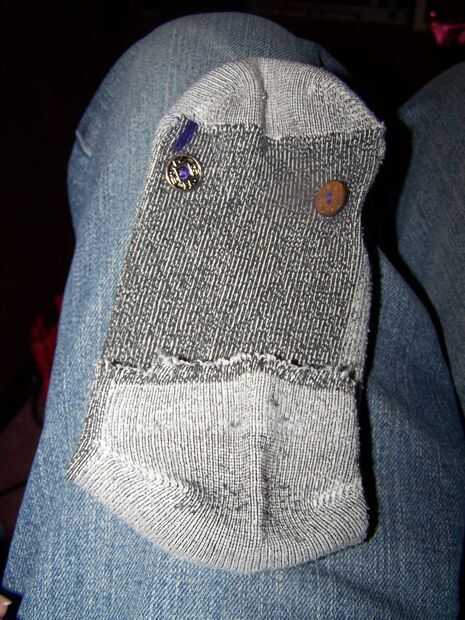 Botón el calcetín dentro del cono, (dedo del pie hacia abajo) con un botón (hacia afuera) a cada lado de la abertura.