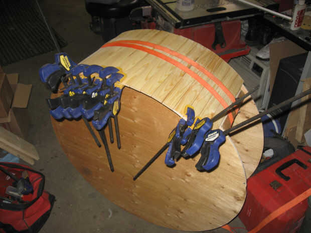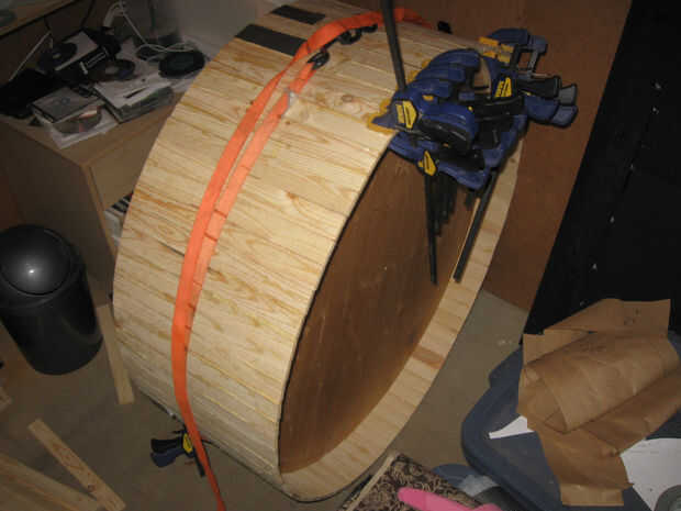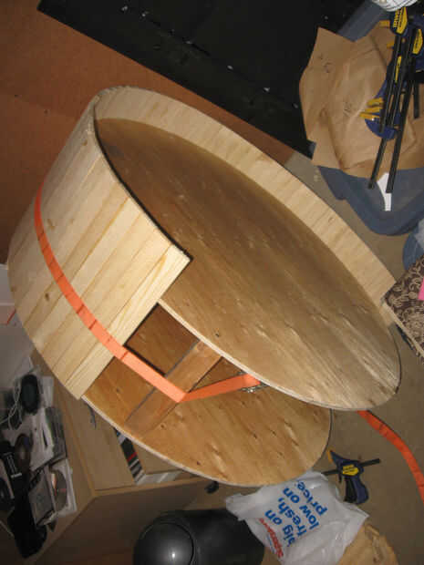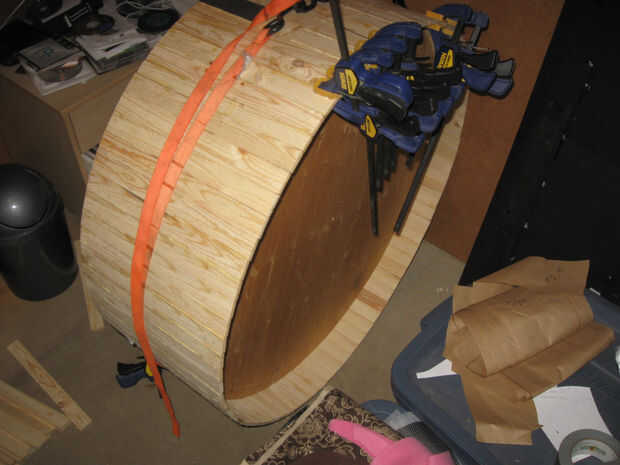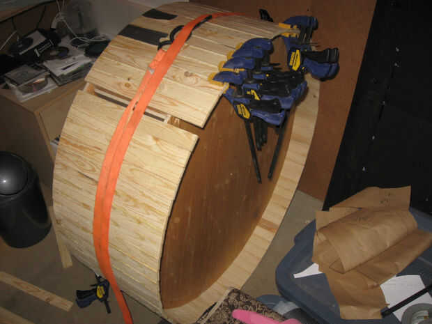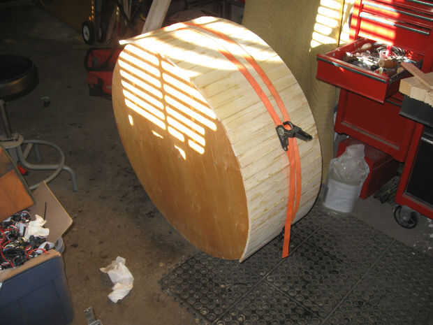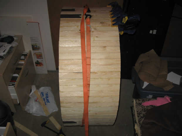 Mediante fricción y fuerza de sujeción, unir el listón cortado (listones). Empecé con apenas 15. Utilice un borde de las secciones de círculo y pegamento 3D juntos para formar un anillo alrededor del exterior con el borde de la madera contrachapada como guía. El objetivo aquí es que ambos lados tan paralelo como sea posible.