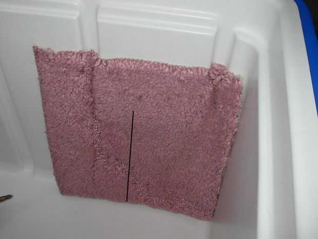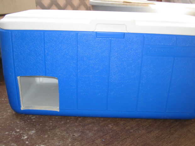 Monte la pieza de alfombra en el interior del enfriador con tornillos para madera 3 - #8, asegurándose de que la puerta está cubierta totalmente. Luego, corte una abertura de 3" de largo hasta la mitad de la alfombra. Esto hace más fácil para ellos salir.