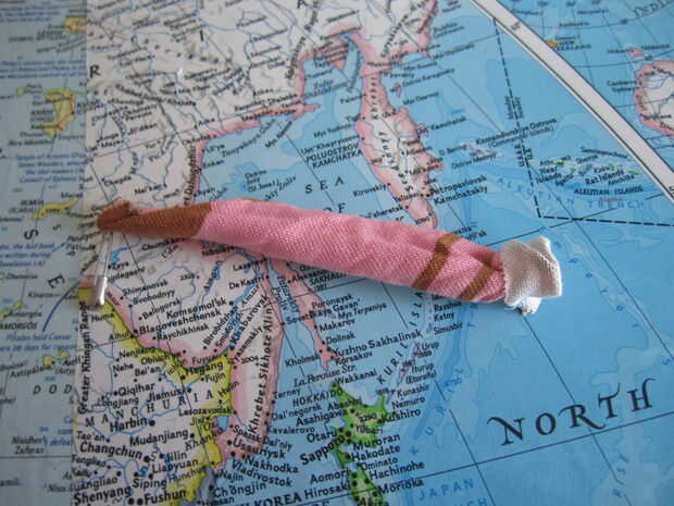 Introduzca un pin de seguridad a través de un lado de la tela cerca de un extremo del tubo y empuje la cabeza de la seguridad en el tubo. Crujir de la tela en el perno de seguridad, tirando de los bordes hacia donde fue el pasador de seguridad. Mantenga scrunching y tirando hasta la tela empieza a girar. Esto sinceramente es la peor parte de todo el proyecto! Todo es suave desde aquí en cabo, lo prometo!