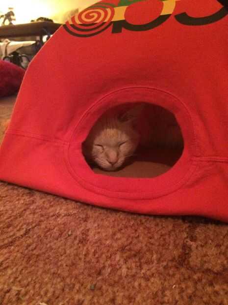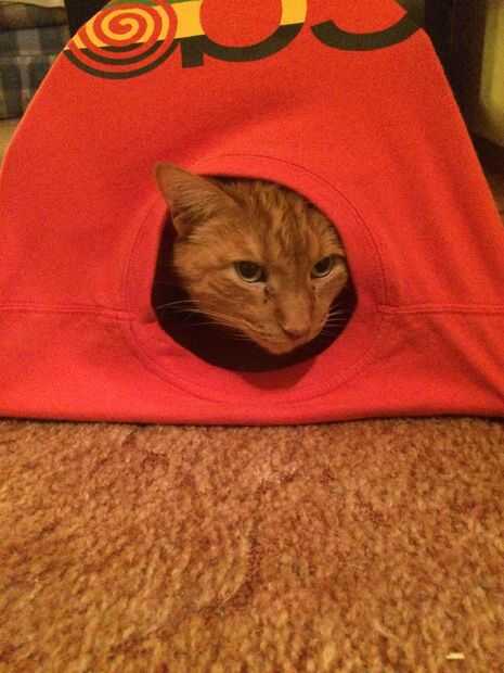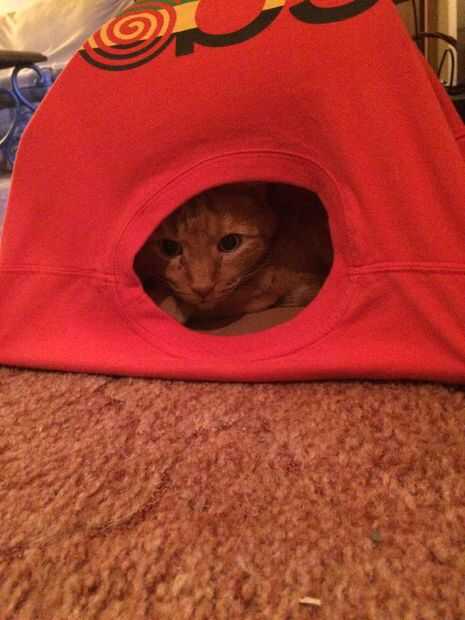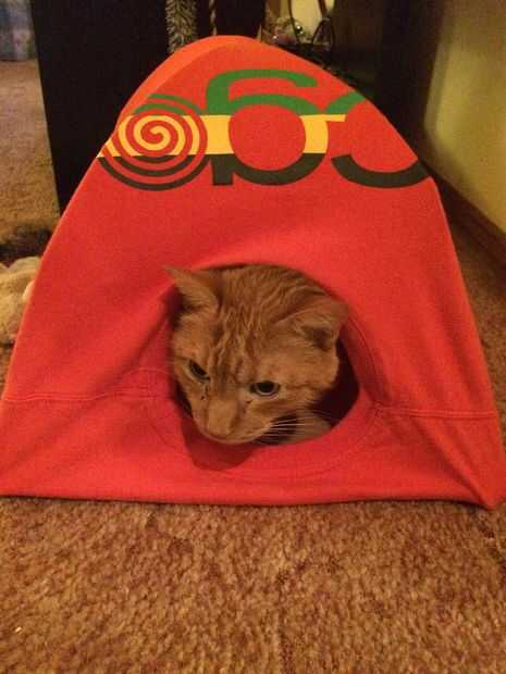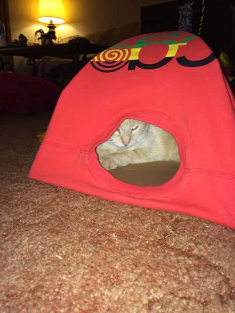 Como se pueden ver que los gatos aman hay tienda. Puedes añadir un juguete colgando de la parte superior, o hacerlo más grande para múltiples gato a utilizar al mismo tiempo. Es portátil y fácil de hacer con materiales que probablemente alrededor de la casa.