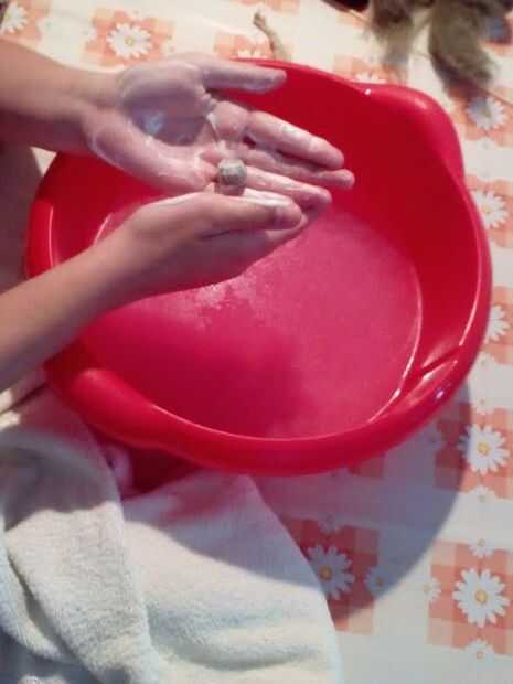 Coge un poco de lana y separe las hebras. Abrigo para arriba en forma de bola un poco debería ser. Luego con un jabón enjabonarse las manos. Agarrar que las manos en forma de bola con jabón y lana comienzan redondeados. En primer lugar, como si fuera un piso, pero si se quiere hábilmente redondeada redondo. Si es demasiado pequeña para incluso una pequeña lana envuélvalo alrededor y continuar al redondeo. Si el balón está listo para dejar de lado un poco de tiempo para secar. Mi pelota es grande 1 pulgada.