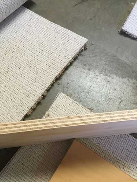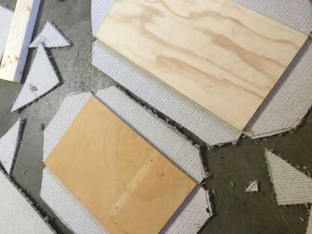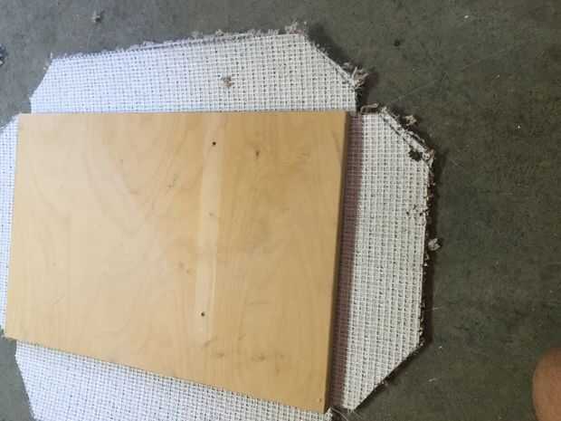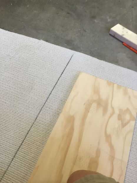 Cortar la alfombra de la alfombra sobre un voladizo de 4" de la marca encima de la alfombra (utilicé un 2 x 4 a cada lado como calibre. Esto permite un amplio espacio envolver la madera contrachapada.