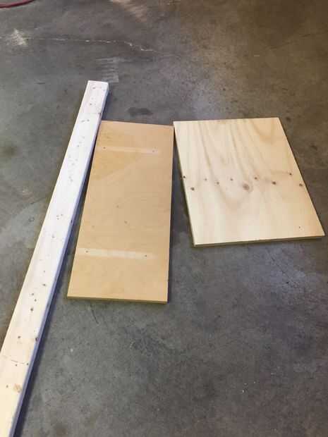 Encontró unos restos de madera contrachapada, cortar hasta un tamaño atractivo. La base es de 15" por 18". La plataforma superior es aproximadamente 12 x 16 (la primera foto muestra la pieza superior antes que cortar un poco.