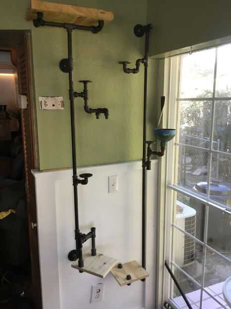 Una cosa puedo decirte, es primero montar los árboles demasiado juntos y el gato no sabía navegar arriba y abajo. Por eso ves el daño de la pared, tuve que pasar el árbol de la izquierda un poco. Usé 1/2 tubo de gas negro. Utilicé el tubo de gas porque es más barato de galvanizado. Bastante un poco más barato también. Deberás rociar con poliuretano aunque se oxida. Incluso del aceite en las manos.