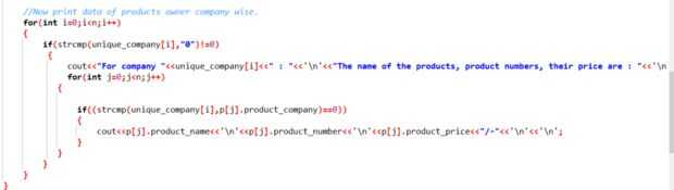 Ahora, tomar cada uno y todos "0" no nombre en la nueva matriz de caracteres y combinar con cada solo producto propietario denominaciones de cada objeto. Primero tomar el primer "0" no el nombre de la nueva matriz y empezar a comprobar con los nombres de propietario de empresas. Cada vez que coincide, hago imprimir todos los detalles del producto. A continuación, pasar a la próxima no "0" el nombre de la matriz y así sucesivamente. Por lo tanto, al final del proceso el console(screen) habrá todos los datos de producto aparece dueño empresa sabia. (Tercera imagen)