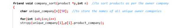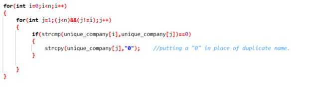 Después de esto elimina todos los nombres de compañía del dueño de producto que ya existen en la matriz mediante la sustitución con el carácter "0". es decir, supongamos que hay dos entradas en esta nueva matriz de caracteres del mismo nombre (decir "Cadbury"), a continuación, simplemente reemplazar la palabra "Cadbury" que ha tenido lugar la segunda vez con un carácter "0". Por lo tanto, esencialmente al final, en esta nueva matriz de caracteres sólo habrá nombres de empresas de propietario únicos y "0" s. Esto hizo tomar la primera entrada de la nueva matriz y verificando con cada otra entrada en la matriz (comprobación de duplicados y eliminarlos). (Segunda imagen)