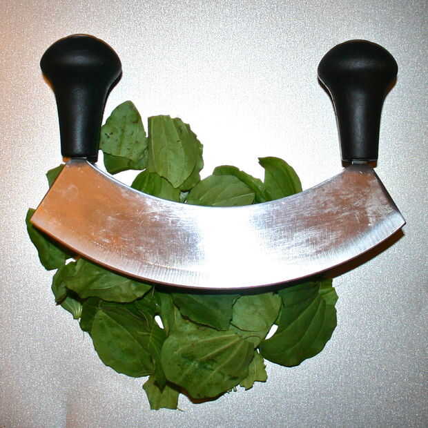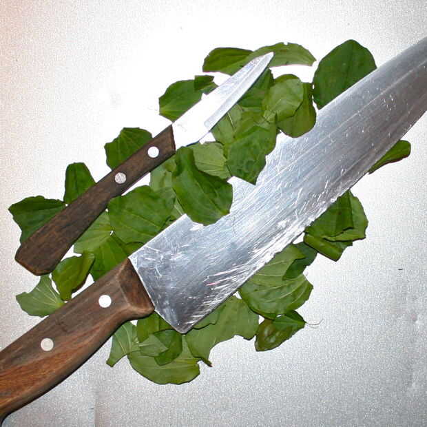 Una vez que las piezas de la opción de plátano, agarrar una tabla de cortar y un cuchillo o un mortero y una maja. En una situación de emergencia sólo puede masticar las hojas en la boca y usar saliva para hacer una cataplasma.