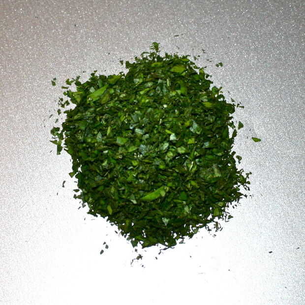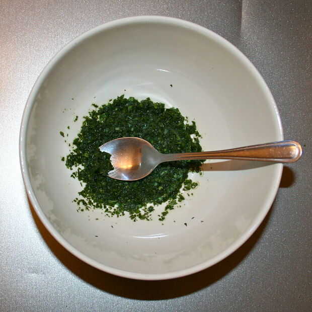 Las hojas de plátano y agregar unas gotas de agua caliente - sólo lo suficiente para mantener Unidas las hierbas picadas.