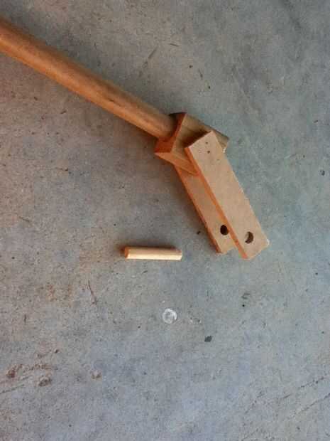 El brazo se compone de un palo de escoba de madera, cerca de 1,5 metros de largo. Lo que atribuimos a la estructura es con dos trocitos de madera a cada lado del marco con pasador va a través de él. La manera que lo hice fue por conseguir un pedacito pequeño de madera y taladrar un agujero de anchura de palo de escoba justo a través de él. Sujetó en un extremo de la escoba con un par de clavos y tgen agregué pedacitos largos de 2 15 cm de madera a cada lado, en un ángulo 30 grados a la escoba. Éstos fueron sujetados con 2 tornillos y luego había un agujero perforado a través de ellos al final. De esta manera la espiga puede deslizarse a través de ambos agujeros en la escoba y en el marco. En el otro extremo de la escoba le puse el fondo de una maceta de plástico viejo para ser el recipiente donde se encuentra el proyectil. La espiga une el brazo con los agujeros en el marco de la tge, y hay múltiples agujeros bajando el marco el ángulo de la catapulta se activa en el simce es ajustable.