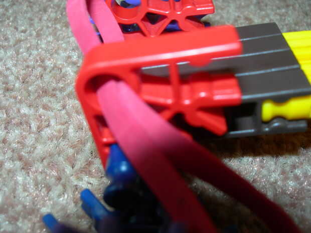Deslice las dos bandas de goma a través de los orificios de los conectores rojos.