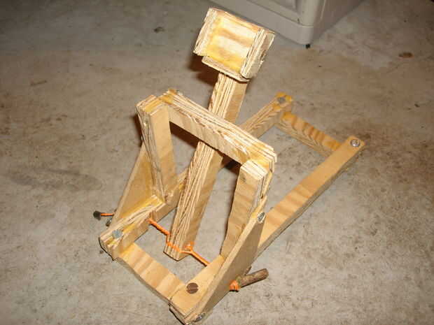 5. tomar la cuerda y ponerlo a través de los agujeros en los extremos de todas las áreas y atar todo junto en una herida encima de moda para que cuando la cesta se tira hacia atrás, es liberado y todo lo que tienes en la cesta lanza.