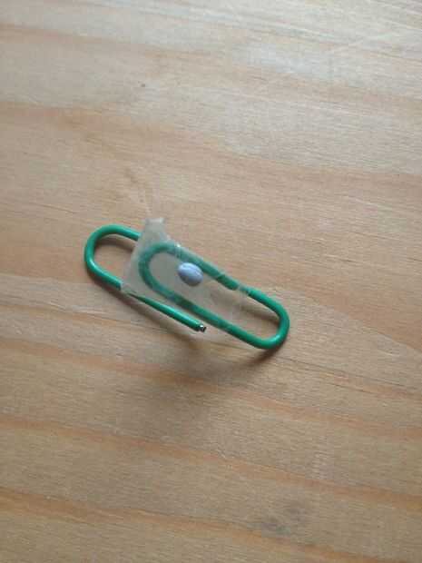 lo siento no hay fotos no hay.  Asilo, t tiene mucho tiempo. para esto se necesita:2 clips de papel y un par de pinzas. simplemente doblar uno de los extremos. Utilice un trozo de papel para probar.