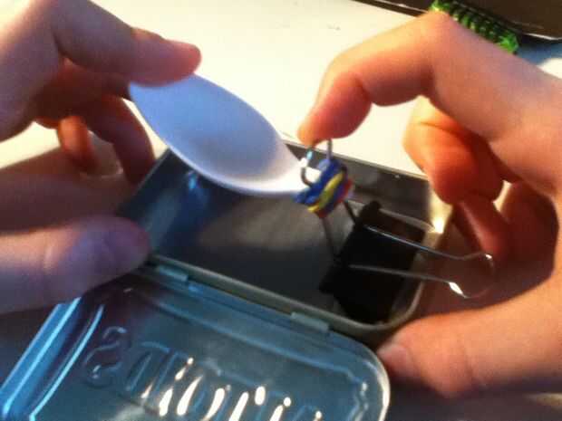 Coloque la cuchara al lado de la lata Altoids así que usted podría medir o estimación que debe ser el corte. Recuerde que la cuchara cortada debe caber comfortablemente en la lata sin pegarse fuera de la lata.Paso 1: Coloque la cuchara en el Clip de