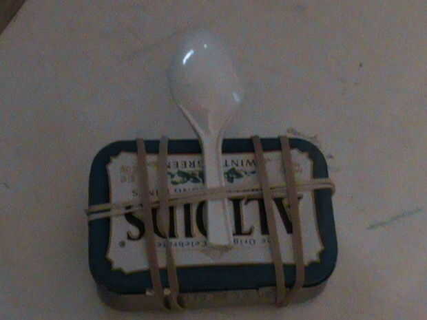 Coloque la cuchara al lado de la lata Altoids así que usted podría medir o estimación que debe ser el corte. Recuerde que la cuchara cortada debe caber comfortablemente en la lata sin pegarse fuera de la lata.Paso 1: Coloque la cuchara en el Clip de