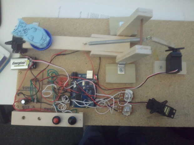 Para este proyecto, comenzó con un tutorial que encontré aquí en Instructables: Arduino-Controlled catapulta. Esto fue un gran instructable para comenzar con, como no estoy familiarizado con proyectos de Arduino y este es mi primer intento. El instructivo incluye unas fotos de buena calidad, un breve video del funcionamiento de la catapulta, una lista detallada de las piezas, técnicas, una copia de la disposición de circuito y el programa que ejecuta el Arduino. Estas herramientas fueron muy útiles para proporcionar un punto de partida y ayudar a crear este impresionante proyecto.