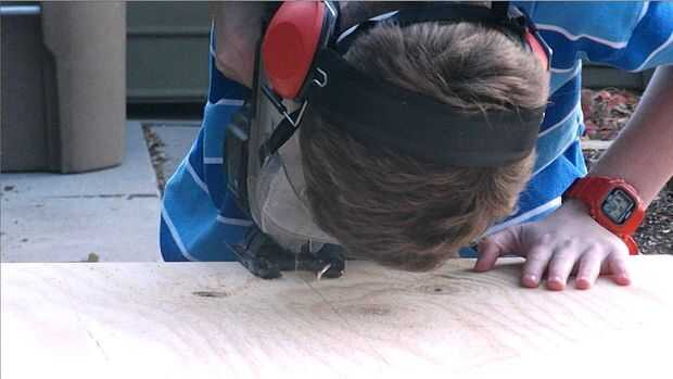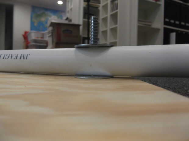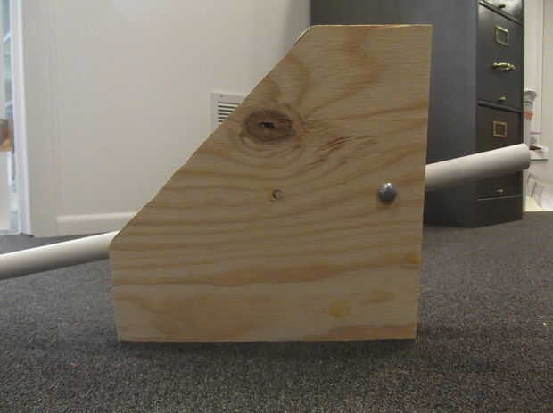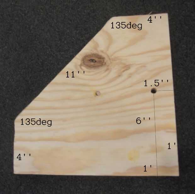 Corte los soportes del brazo como se muestra. Las únicas partes que usted necesita para cortar son los soportes de brazo. Corte un poco de exceso triangular, y el remanente es la base de la trebuchet - exactamente 1'x 2'. Perfore un agujero para el perno del brazo como se muestra, con un 5/16 '' de bits. Una vez que hayas hecho esto, usted puede probar montar el brazo y las arandelas por les capas como se muestra. Una vez que pones el otro brazo de apoyo en el otro lado, debe parecerse a la imagen final.