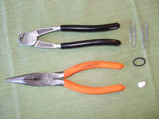 lo siento no hay fotos no hay. Asilo, t tiene mucho tiempo. para esto se necesita:2 clips de papel y un par de pinzas. simplemente doblar uno de los extremos. Utilice un trozo de papel para probar.