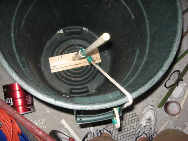 La catapulta está ahora en condiciones de trabajo. En este punto debería poder probarlo tirando de la cadena. Debe lanzar y ser bastante fácil de resetear presionando el pasador hacia abajo y girando.