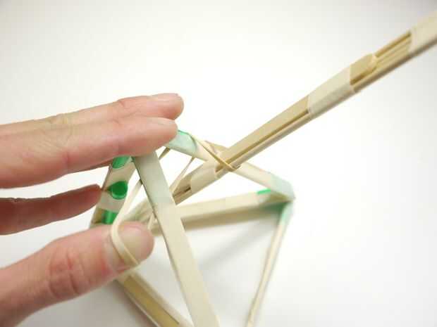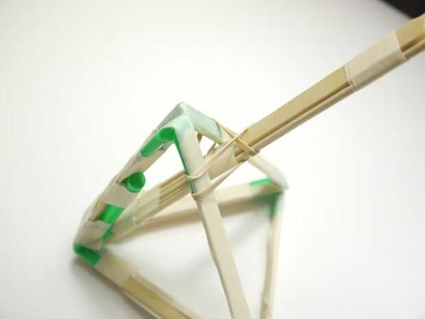 Lazo una goma alrededor del brazo de la catapulta, a continuación, tire de ella a través del marco de la pirámide. Estirar la goma y tire de él sobre el brazo de la catapulta otra vez.