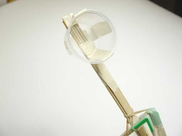 Coloque un pedazo de cinta en un ángulo perpendicular en la parte posterior del brazo de la catapulta. Mantenga una taza cerca de la parte superior del brazo y enrollar los extremos de la cinta a los lados de la Copa. Asegúrese de dejar algunos de los pinchos expuestos en la parte superior del brazo de la catapulta. Use más cinta para fijar la taza en el brazo de la catapulta.