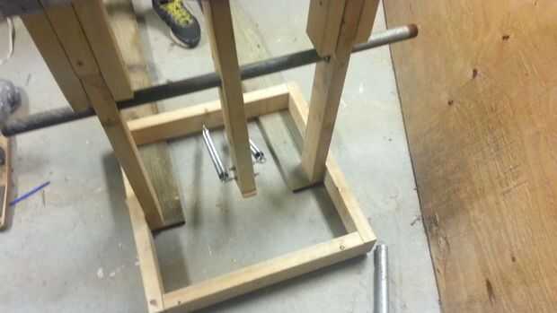 La base es un cuadrado de 2 x 2 pies con 2 columnas de 3 pies. Los montantes se atornillan en el interior de la caja en el centro del marco.