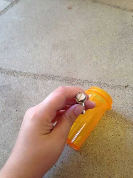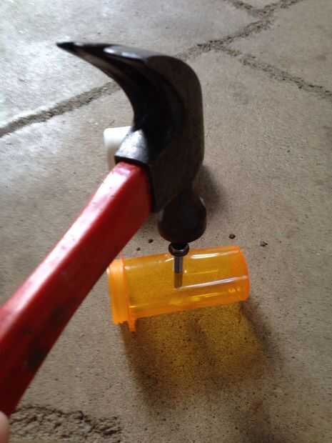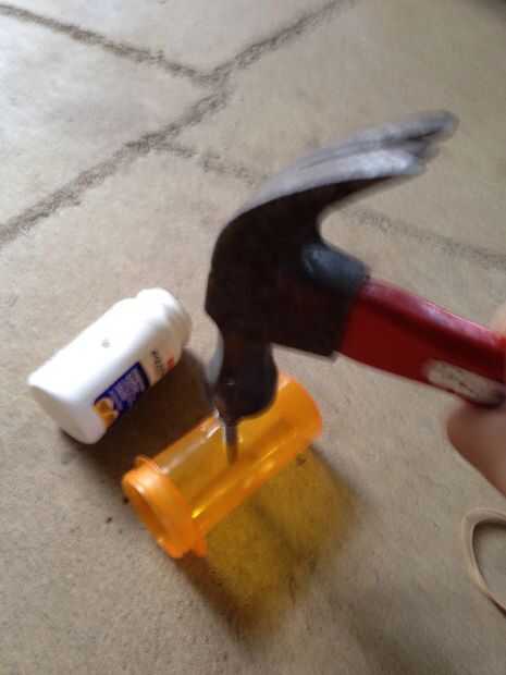 Primero que desea tomar el martillo y el tornillo del martillo o clavo en la mitad de las botellas de la píldora. Encontré eso si usted idea. Tornillo de fácil porque sólo tienes que perforar la botella, y usted puede el giro del tornillo para hacer el agujero más grande. Dependiendo de qué tipo de píldora botella utilizas este paso podría tomar más tiempo.