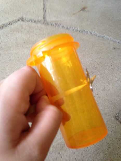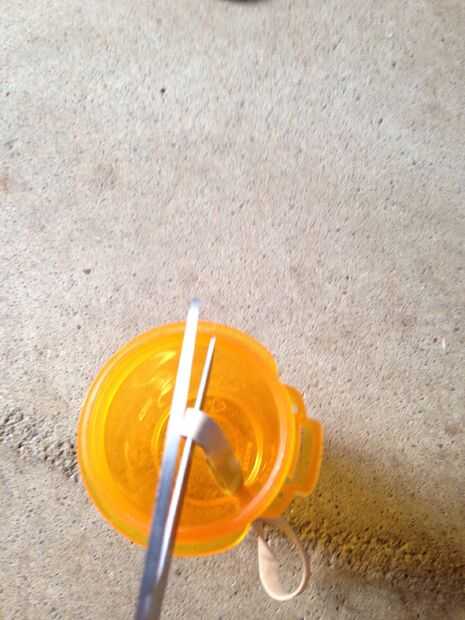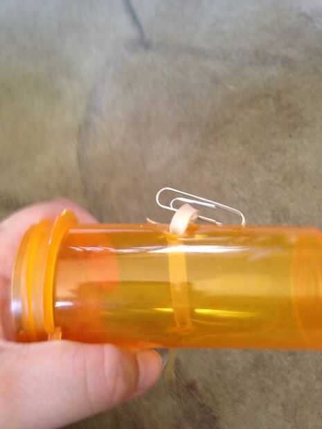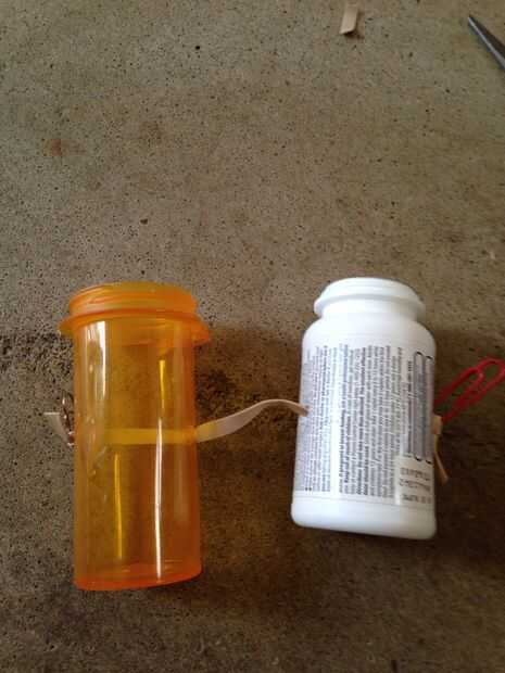 Cortar la goma una vez y pase de un lado a través de la botella una pastilla. Luego fije la banda elástica para el clip de papel como tal. Entonces tire con fuerza. Luego hacer lo mismo con la otra botella de píldora y otro lado de la banda. Ahora debe tener algo como la foto número 3.