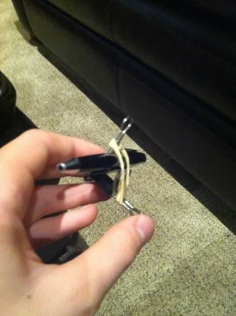 Vas a poner el elástico en los brazos de la pinza y pluma. Poner sobre y envuélvalo alrededor de cada brazo dos veces. Entonces voilá! Una catapulta de oficina terminada. Este es mi primer Instructable, así que tómatelo con calma en mí :-)