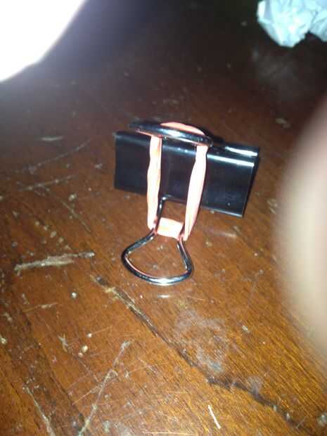 Primero doblar el clip binder para hacer los clips en la parte posterior. Entonces la goma y torcerlo y juntar los lados en un dedo. Repita este paso una vez. A continuación coloque el clip. Después de tendrá que poner el pluma/del lápiz a través de la banda.