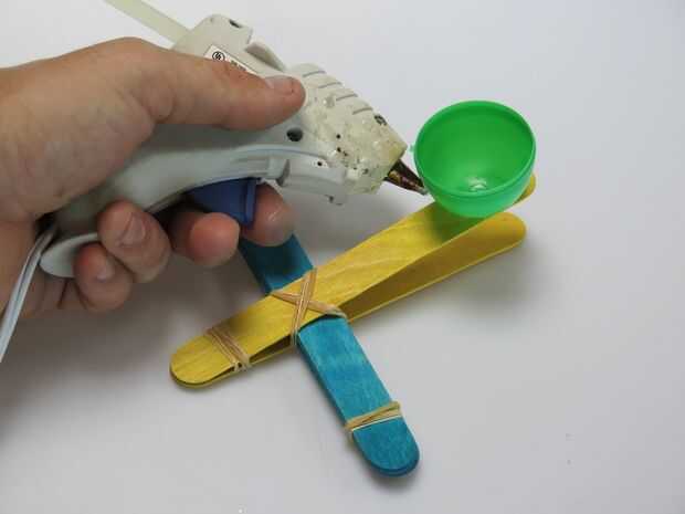 Huevo de plástico, tapa de la botella, arcilla o papel doblado, pegamento caliente al final del anillo de goma. Cargar con algunos proyectiles, tire hacia atrás, objetivo (no en los seres humanos o animales) y lejos del fuego!