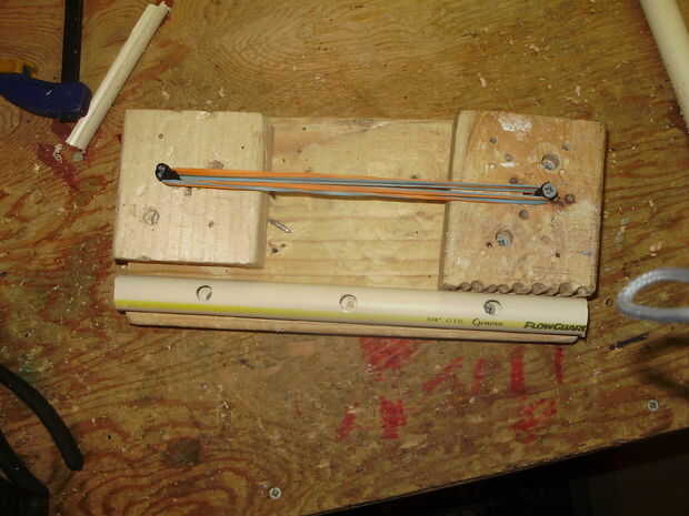 recientemente vi un programa de televisión sobre la actividad más americano jamás inventado; "Punkin Chunkin." Una categoría en la fue catapultas de torsión desarrollada. (algunos otros eran humanos powered, cañones de aire, fuerza centrífuga, así sucesivamente.) Usé un 2 x 4 para los base y pequeño pedacitos de madera que las bandas de goma, con la ayuda de tornillos. El pvc alrededor y alrededor de la torcedura, luego apunte éste y dejarlo ir. El tubo de pvc extra que puedes ver es sólo para detener el eje de la catapulta de golpear el suelo. Dispara unos 15-20 pies.