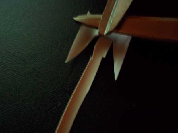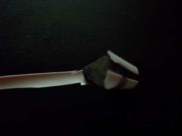 La bolsa requiere de algunos cortes simples para completar. Yo iba para más de una taza dentada para la bolsa que liberaría a la piedra con el mínimo esfuerzo. Ésta se realiza perfectamente. Se ve muy descuidado pero yo estaba impaciente por intentar disparar la máquina (rubor).