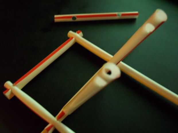 Otra razón es especialmente desafiante es que este modelo utiliza pestañas para conectar la estructura con la base. Pestañas o solapas ofrecen una conexión muy segura sin necesidad de una paja de jet más allá del punto de intersección. Mientras que esto le da una buena base plana, va confundir su paciencia. Esto es donde el pincho de madera le ayudarán. Usted utilizar la brocheta de madera para las aletas de las lengüetas del tirón en orientación mientras deslice una segundo paja fileteada en los soportes base asegurando así las pestañas permanentemente en posición.