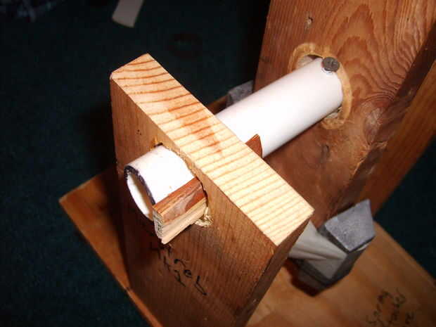 Si eres corto de pegamento, use las madera peg/clavijas presionándolos entre el eje y el interior de los orificios del brazo de apoyo hasta que el árbol está firmemente en su lugar. Si eres como yo, tanto hacerlo y usar el pegamento para tener un apoyo firme.