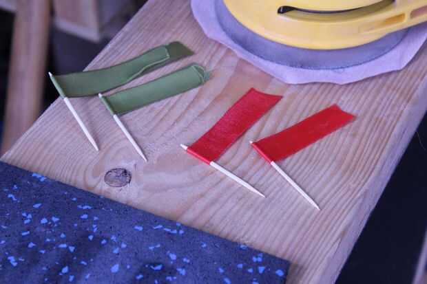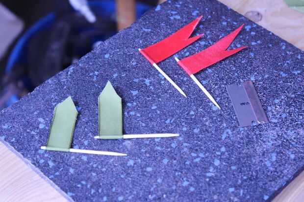 Tenemos que hacer algunas banderas así que agarré unos palillos y allanaron el fiances habitación para alguna cinta de costura. Luego colocar las tiras de cinta plana y había rociada con algún pegamento de contacto. Después de unos 30-60 segundos me coloca un palillo en el centro y doblar la cinta alrededor de ella. Entonces usando unas tijeras afiladas o una cuchilla de que cortar a la forma final.